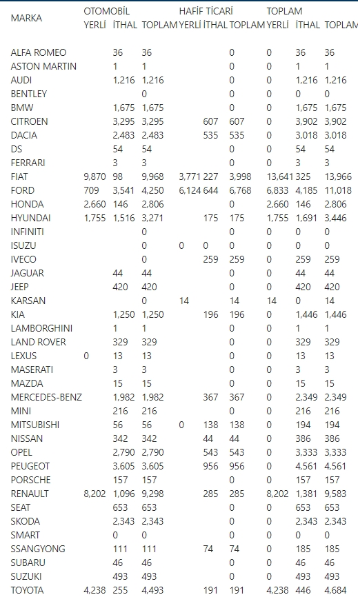 Ardından 3 bin 605 adetle Peugeot, 3 bin 295 adetle Citroen, 3 bin 271 adetle Hyundai, 2 bin 806 adetle Honda ve 2 bin 790 adetle de Opel sıralandı.