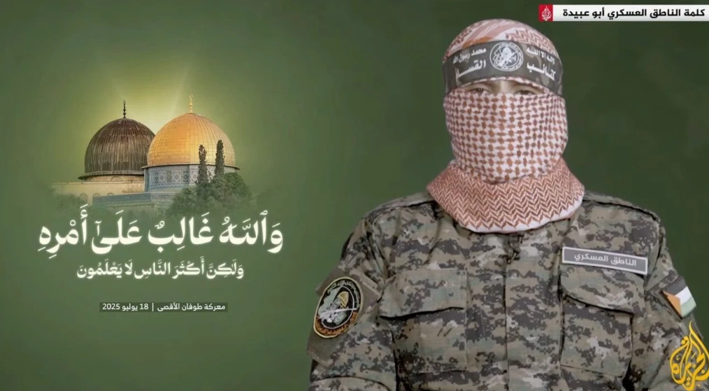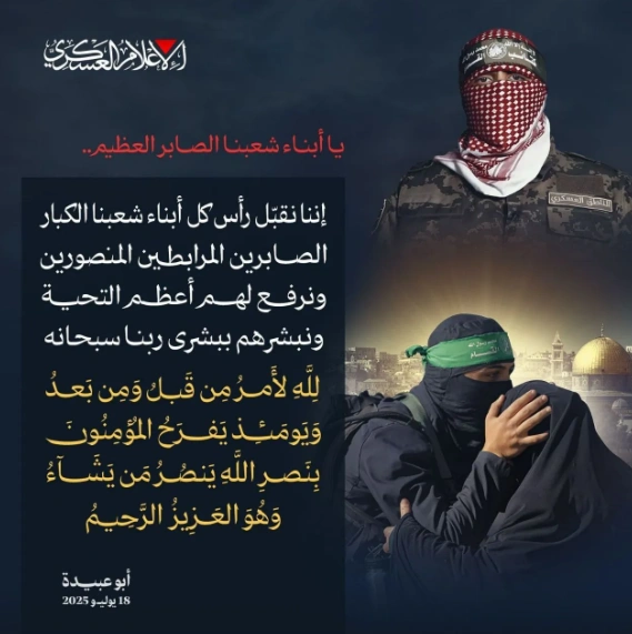 Kassam Tugayları, resmi Telegram hesaplarından yaptıkları paylaşımda Sözcü Ebu Ubeyde'nin görüntüsü ve 18 Temmuz 2025'teki bir sözüne yer verdikleri bir paylaşımda bulundu.