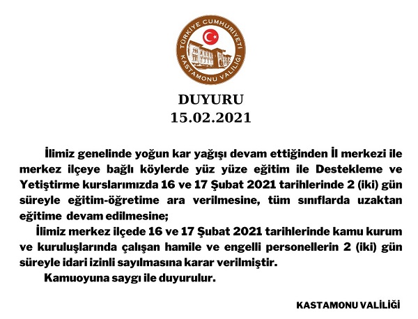 Kastamonu’da kar yağışı sebebiyle 15 ve 16 Şubat tarihlerinde yüz yüze eğitim yapılmadı. Kastamonu Valiliği’nden yapılan açıklamada 17 Şubat Çarşamba günü de yüz yüze eğitime başlanmayacağı belirtildi.