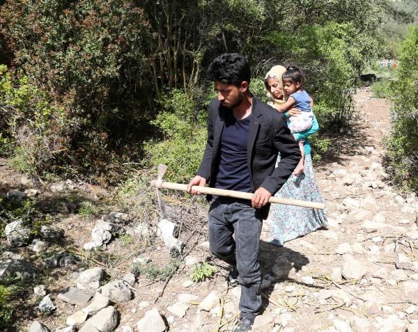 Baba İbrahim Yıldız kazmasıyla salep ararken, anne Ayşe Yıldız da kucağından hiç indirmediği kızıyla eşine destek oluyor.