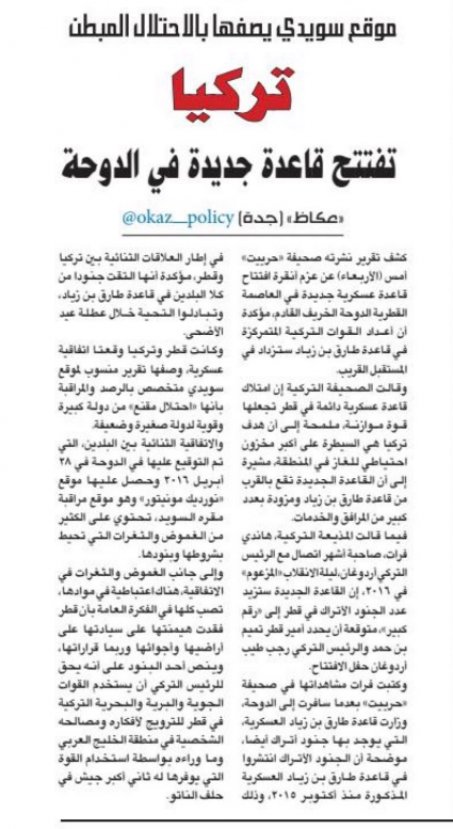 yeniakit.com.tr İlk olarak 2015 yılında Tarık bin Ziyad Askeri Üssünü açan Türkiye, Katar'daki Türk askeri üssü sayısını ikiye çıkarma kararı alırken, bu durum ABD-İngiltere kontrolündeki Suudi Arabistan, Birleşik Arap Emirlikleri ve Bahreyn gibi ülkelerde büyük endişeye sebep oldu. Katar’ı Türkiye’nin sömürgesi olarak tanımlayan gazete ve twitter adresleri, Katar’ı dışlayan yorumlarda bulundu.