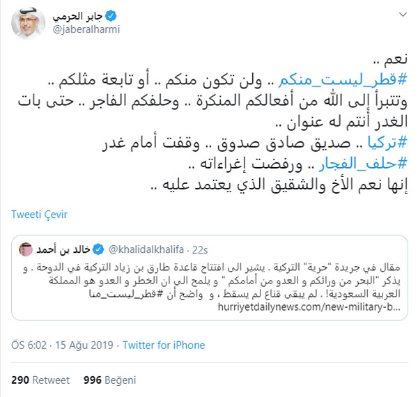 Katarlı gazeteci Cabir el-Haremi, Bahreyn Dışişleri Bakanı Khalid el-Khalife’nin “Katar bizden değildir” sözlerine karşılık “Evet, Katar sizden değildir. Ve sizden olmayacaktır da... Sizin gibi uydu da olmayacaktır. Sizin kabahatlerinizden Allah’a kaçmıştır. Fücur ittifakınız... Türkiye çok yakın bir dosttur. Fücur ittifakının önüne dikildi ve onları durdurdu. Türkler ne güzel bir kardeştir.”