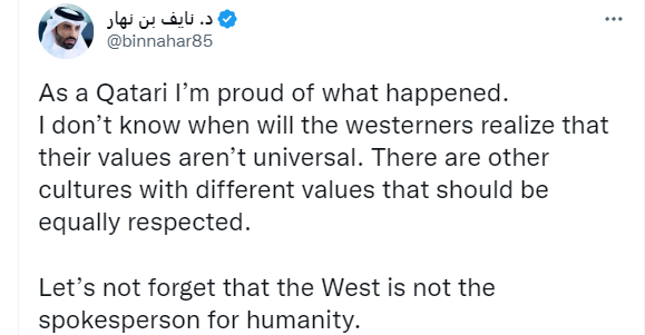 Bir Katarlı olarak olanlardan gurur duyuyorum. Batılılar değerlerinin evrensel olmadığını ne zaman anlayacak bilmiyorum. Eşit derecede saygı gösterilmesi gereken farklı değerlere sahip başka kültürler de vardır. Unutmayalım ki Batı insanlığın sözcüsü değildir.