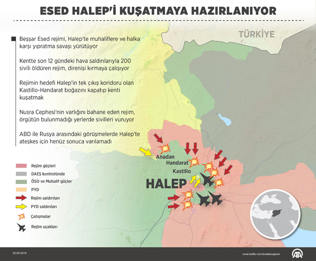 Şubat ayı başında Rus savaş uçaklarının hava desteğiyle, muhalifleri kuzeyden çevreleyerek, Türkiye-Halep insani koridorunu kapatan katil Esed rejiminin şimdiki hedefi, merkezdeki muhaliflerin tek çıkış yolu olan Kastilo-Handarat boğazını kapatmak. Boğaz, Halep merkezden İdlib'e, oradan Türkiye sınırına uzanan muhaliflerin kontrolündeki alana geçit sağlıyor.