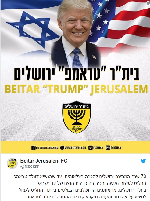 ABD Başkanı Donald Trump'ın Kudüs'ü 'İsrail'in başkenti' olarak tanıması ve ABD Büyükelçiliği'nin Tel Aviv'den Kudüs'e taşınmasının ardından İsrail futbol takımı Beitar Jerusalem, kulübün ismini Beitar Trump Jerusalem olarak değiştireceğini açıkladı.