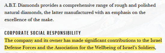 Bu nisan ayında Anglo Amerikan Yıllık Genel Kurul Toplantısında (Annual General Meeting-AGM) De Beers'in web sitesinde bunu doğrulayan sayfa kaldırıldı. Fakat aşağıda bir arşiv var: ABT ve sahibi “İsrail ordusuna önemli katkılarda bulundu."