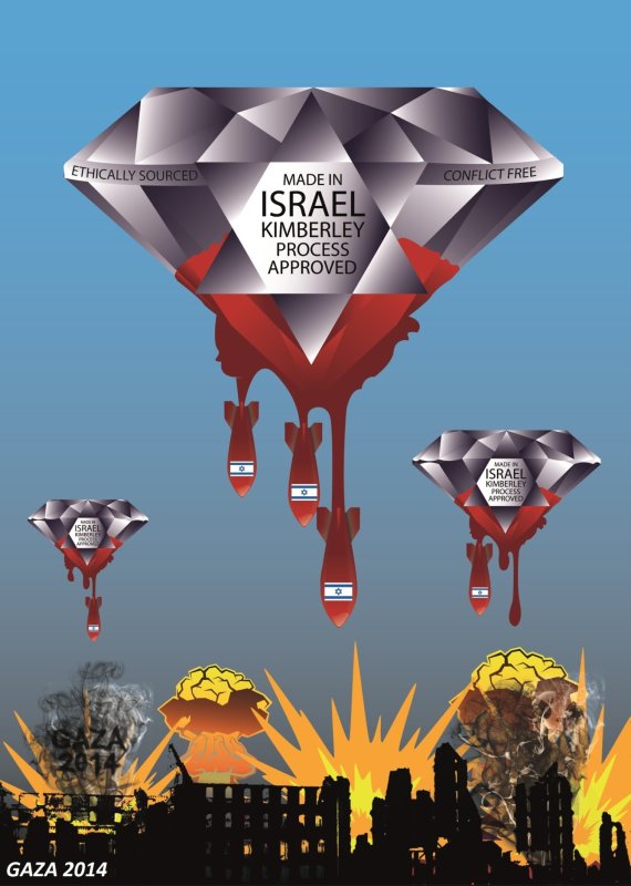 Makalenin sonunda yer alan ve 2014 Gazze bombardımanının elmas ticaretiyle elde edilen gelirle yapıldığını anlatan bir çizim. İsrail 2014 bombardımanında Gazze'deki tüm alt yapıyı çökertmiş, büyük maddi hasar oluşturmuştu. 8 Temmuz 2014'te başlayan hava,deniz ve kara saldırısına "Koruyucu Hat Operasyonu" adı verilmişti. Saldırı tam 50 gün yoğun bombardımanla sürmüştü. BM verilerine göre 2251 Filistinli hayatını kaybetti.