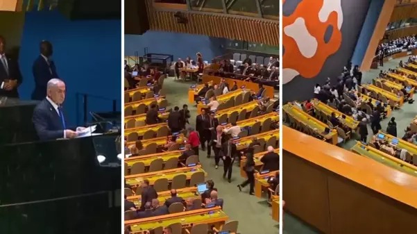 New York sokaklarında uğradığı protestolar sonrası Birleşmiş Milletler binasına gelen işgalci İsrail Başbakanı Netanyahu, BM kürsüsüne çıkarak yaptıkları katliamları aklamaya çalıştı. Netanyahu'nun konuşması sırasında Türk heyeti ve birçok delegasyon salonu terk etti.