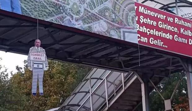 Boynundan iple asılan maketin üzerinde 'Terörist İsrail' yazısı yer aldı. Maket üst geçitten kaldırılırken olayla ilgili inceleme başlatıldı.