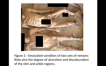 Figür 2 : Aşırı kilo kaybına uğramış 2 ceset. Not: açık yara, bacak ve ayak bileği bölgelerinde oluşan renk değişimi. Suriye Ordusu'nda 13 yıl askeri polis olarak görev yapan bir kişi, çalışma arkadaşlarıyla birlikte ülkede yaşanan iç savaş boyunca, rejime bağlı askeri hastanelere getirilen cesetlerin fotoğraflarını çekmekle görevlendirildi. Hastaneye getirilenlerin tamamı gözaltında işkence, elle boğma ve aç bırakılarak öldürülen Suriyeli muhaliflerden oluşuyordu. Cesetlerin yüz ve bedenlerine elle yazılan şifreli notları da gösteren fotoğraflar, Suriye ordusu içinde sistematik olarak verilen öldürme emirlerinin yerine getirildiğine dair belge olarak kabul edildi.