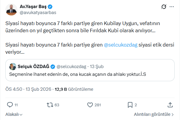 Selçuk Özdağ’ın mezkûr paylaşımına cevap veren Baş, Özdağ’ın siyasi geçmişini tek cümleyle özetledi: “Siyasi hayatı boyunca 7 farklı partiye giren Kubilay Uygun, vefatının üzerinden on yıl geçtikten sonra bile Fırıldak Kubi olarak anılıyor… Siyasi hayatı boyunca 7 farklı partiye giren Selçuk Özdağ siyasi etik dersi veriyor…”