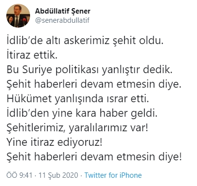 Şener "İdlib’de altı askerimiz şehit oldu. İtiraz ettik. Bu Suriye politikası yanlıştır dedik. Şehit haberleri devam etmesin diye. Hükümet yanlışında ısrar etti. İdlib’den yine kara haber geldi. Şehitlerimiz, yaralılarımız var! Yine itiraz ediyoruz! Şehit haberleri devam etmesin diye!" ifadelerini yazdı.