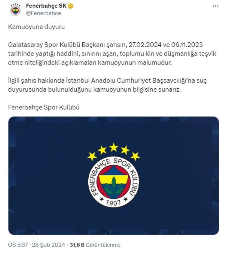 "Galatasaray Spor Kulübü Başkanı şahsın, 27.02.2024 ve 06.11.2023 tarihinde yaptığı haddini, sınırını aşan, toplumu kin ve düşmanlığa teşvik etme niteliğindeki açıklamaları kamuoyunun malumudur.