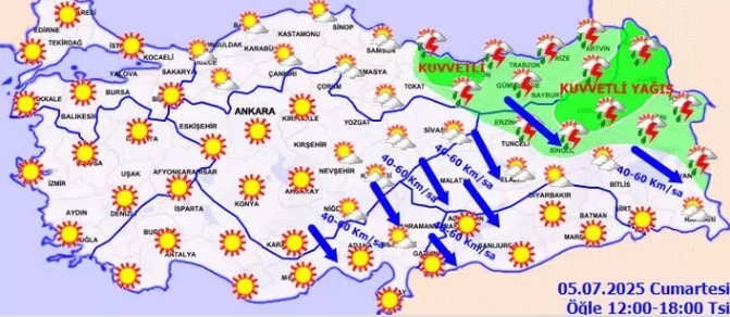 Yağışların Doğu Anadolu'nun kuzeydoğusu ile Samsun'un doğu, Tokat'ın kuzeydoğu çevrelerinde yer yer kuvvetli, Ordu ve Giresun çevrelerinde yer yer çok kuvvetli olması bekleniyor.