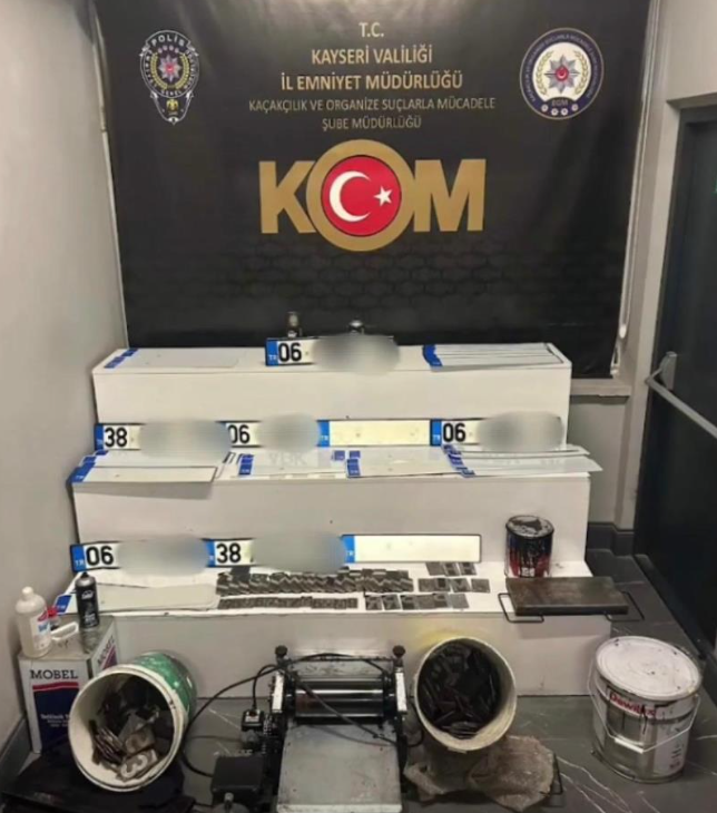 Kayseri’de polis ekipleri tarafından yapılan baskında; sahte plaka basımı yapan 2 şahıs yakalanırken, çok miktarda sahte plaka yapımında kullanılan malzeme ele geçirildi.
