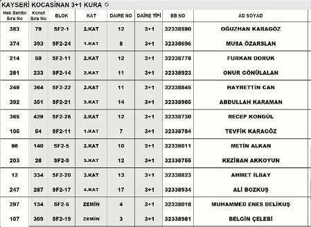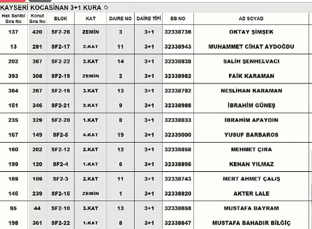 TOKİ Kayseri Kocasinan kura çekiliş sonuçları