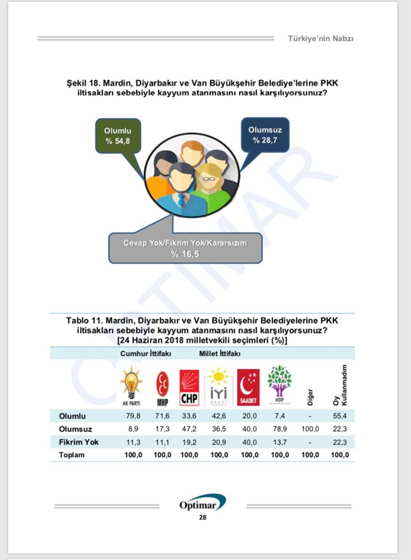 Araştırmada, “Diyarbakır, Mardin ve Van Büyükşehir Belediyelerine Kayyım atanmasını nasıl karşılıyorsunuz' sorusuna katılanlar açık ara farkla yani yüzde 54.8 ile 'Olumlu buluyorum' cevabını verdi. ‘Olumsuz’ bulanlar yüzde 28.7, ‘Fikrim yok’ diyenlerin ise yüzde 16.5 olduğu görülüyor.