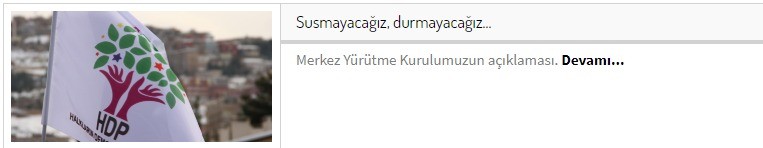 Oğuzhan Çağlar yeniakit.com.tr HDP, kayyım atamalarının ardından direniş çağrısı yaptı. İnternet sitesinden yayınlanan MYK kararlarıyla Doğu ve Güneydoğu illerindeki HDP teşkilatları, Van, Diyarbakır ve Mardin’de yer alan HDP il binalarının önünde eyleme çağırıldı. HDP Kadın Meclisi tarafından yapılan açıklamada da, “Biz sözümüzün arkasındayız: Susmuyoruz, korkmuyoruz, itaat etmiyoruz, direneceğiz.” ifadeleri kullanılarak halk direnişe çağırıldı.