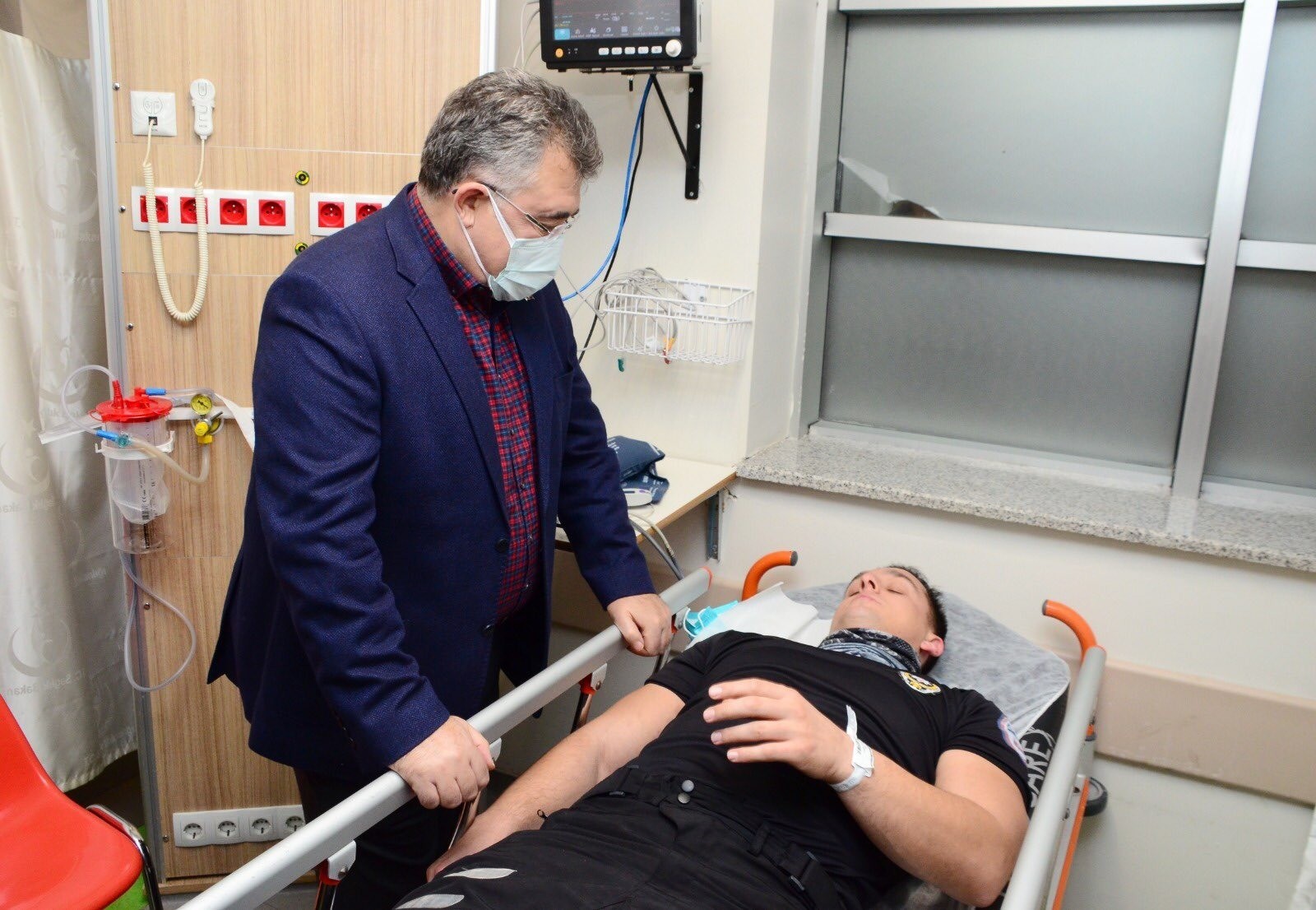 Dikkatleri sayesinde kazayı yara almadan atlatan 2 polis memuru, sağlık ekiplerince tedbir amacıyla Kocaeli Devlet Hastanesi’ne kaldırıldı. Hastaneye kaldırılan iki polis memurunu Kocaeli Emniyet Müdürü Veysel Tipioğlu ziyaret etti.