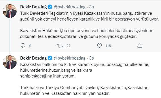 Bozdağ resmi Twitter hesabından yaptığı paylaşımla Kazakistan’da yaşananların kirli bir oyunun parçası olduğunu belirterek, “Türk Devletleri Teşkilatı’nın üyesi Kazakistan’ın huzur, barış, istikrar ve gücünü yok etmeyi hedefleyen karanlık ve kirli bir operasyon yürütülüyor. Kazakistan Hükümeti, bu operasyonu ve hadiseleri bastıracak, yeniden sükuneti tesis edecek, istikrarı ve gücünü koruyacak güçtedir. Kazakistan halkının bu kirli ve karanlık oyunu bozacağına, ülkelerine, hükümetlerine, huzur, barış ve istikrara sahip çıkacağına inanıyorum. Türk halkı ve Türkiye Cumhuriyeti Devleti, Kazakistan’ın, Kazakistan hükümetinin ve Kazakistan halkının yanındadır.” ifadelerini kullandı.