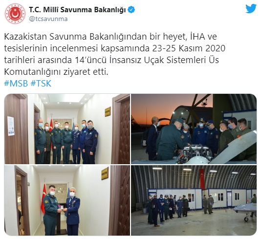 Ziyarete ilişkin Milli Savunma Bakanlığı'ndan yapılan açıklamada, "Kazakistan Savunma Bakanlığından bir heyet, İHA ve tesislerinin incelenmesi kapsamında 23-25 Kasım 2020 tarihleri arasında 14’üncü İnsansız Uçak Sistemleri Üs Komutanlığını ziyaret etti." ifadelerine yer verildi.