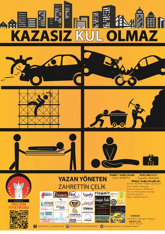 İstanbul Gelişim Sanat tarafından 81 ilde sahnelenen ''KAZASIZ KUL OLMAZ'' adlı oyunu seyircilerin beğenisine sunuldu .İstanbul Gelişim Sanat tarafından 81 ilde sahnelenen Kazanın büyüğü ihmalin küçüğü ile başlar. Bilindiği üzere soma faciası bir çok insanımız yaşamını yitirdi. Biz İstanbul gelişim sanat olarak soma da acıyı paylaşmak üzere ve gerekli inceleme yapılması için ziyaret ettik. Bu kazaları 5 yıldır olacağını hep tiyatro oyunlarımızda olacağını dramatize ediyorduk. Keşkeler olmaması için KAZASIZ KUL OLMAZ oyunu 2009 da kaleme alındı..
