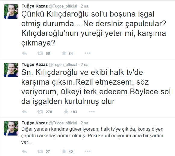 Kazaz, Twitter hesabından, "Kendine güveniyorsan, Halk tv'ye çık da, konuş diyen çapulcu arkadaşlarımız olmuş. Peki kabul ediyorum ama bir şartım var... Sn. Kılıçdaroğlu ve ekibi Halk tv'de karşıma çıksın. Rezil etmezsem, söz veriyorum, ülkeyi terk edeceğim. Böylece sol da işgalden kurtulmuş olur. Çünkü Kılıçdaroğlu solu boşuna işgal etmiş durumda... Ne dersiniz çapulcular? Kılıçdaroğlu'nun yüreği yeter mi karşıma çıkmaya?" ifadelerini kullandı.