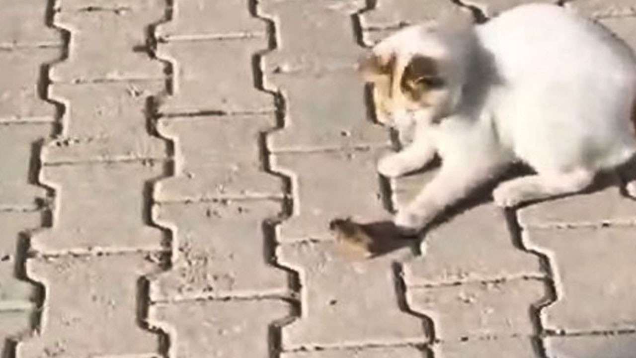 Elazığ’da bir kedi, yakaladığı fareyle uzun süre oyun oynadı. O anlar telefon kamerasına böyle yansıdı.