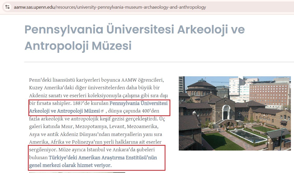 Pennsylvania Üniversitesi'ne bağlı Arkeoloji ve Antropoloji Müzesi, ayrıca İstanbul ve Ankara'da şubeleri bulunan Türkiye'deki Amerikan Araştırma Enstitüsü'nün de genel merkezi olarak hizmet veriyor.