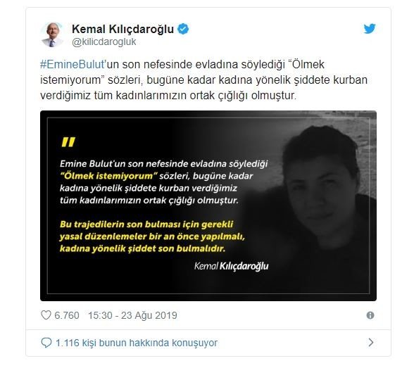 Bulut'un fotoğrafını paylaşan Kemal Kılıçdaroğlu, "EmineBulut’un son nefesinde evladına söylediği 'Ölmek istemiyorum' sözleri, bugüne kadar kadına yönelik şiddete kurban verdiğimiz tüm kadınlarımızın ortak çığlığı olmuştur. Bu trajedilerin son bulması için gerekli yasal düzenlemeler bir an önce yapılmalı, kadına yönelik şiddet son bulmalıdır" değerlendirmesini yaptı.