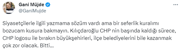 Gani Müjde, "Siyasetçilerle ilgili yazmama sözüm vardı ama bir seferlik kuralımı bozacağım kusura bakmayın. Kılıçdaroğlu CHP'nin başında kaldığı sürece, CHP logosu ile bırakın büyükşehirleri, ilçe belediyelerini bile kazanmak çok zor olacak. Bitti..." dedi.