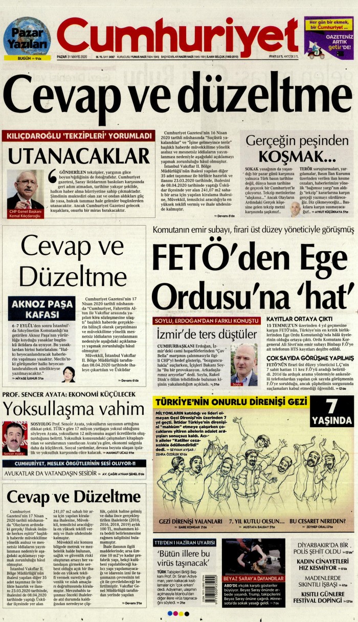 16 Nisan 2020 tarihinde yayınlanan “Suçüstü yakalandılar” ve “İşine gelmeyince terör” başlıklı haberlerinin asılsız olduğu anlaşılan gazete, aynı zamanda 17 Nisan 2020 tarihindeki “Cumhuriyet, Fahrettin Altun ile Vakıflar arasında yapılan kira sözleşmesine ulaştı” ve “Olayların ardındaki gerçek/ Hukuk önünde herkes eşittir” haberleri nedeniyle 3 ayrı tekzip yayınladı.