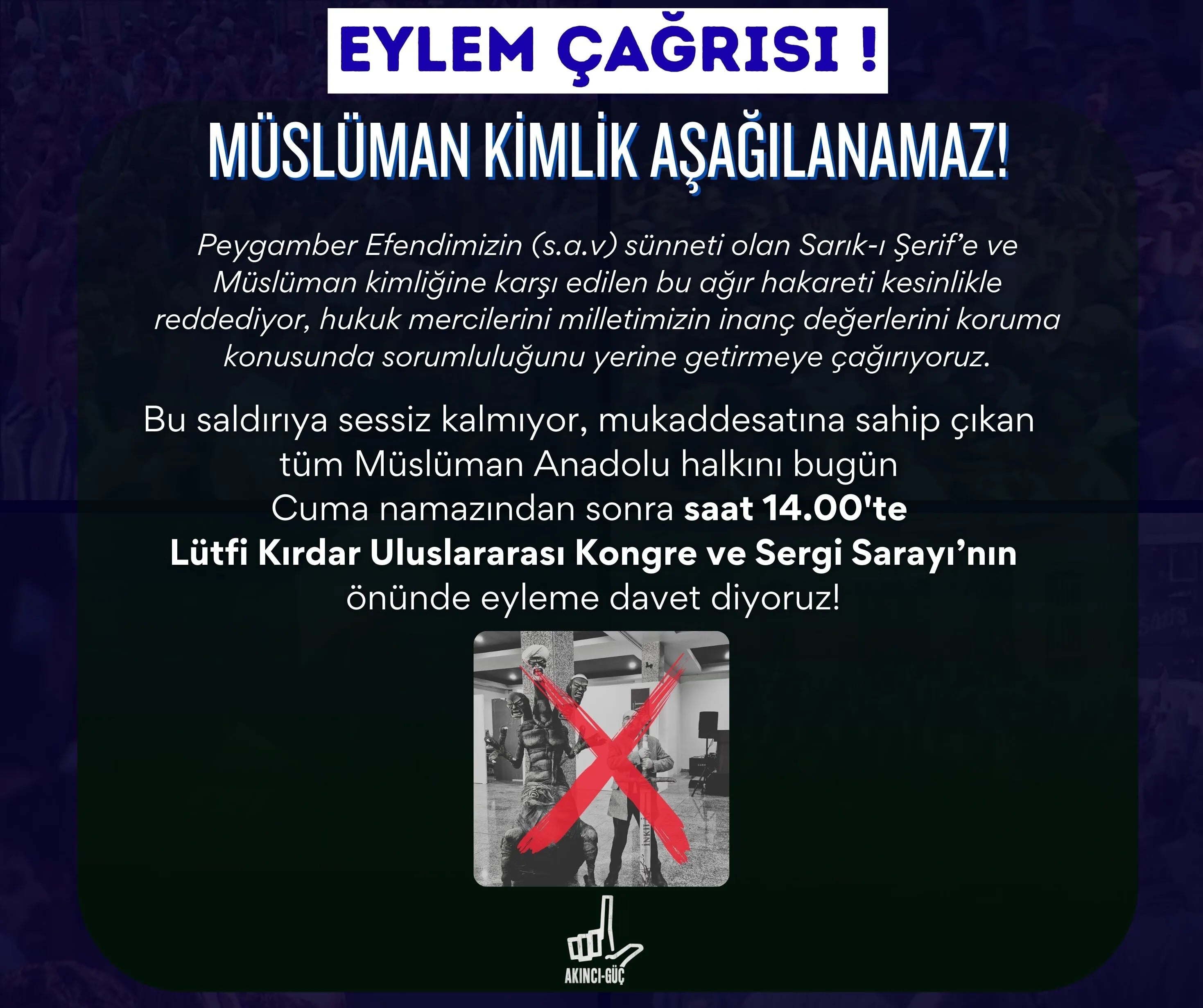 Büyük Doğu Akıncıları Derneği'nin gençlik teşkilatı Akıncı Güç, sergideki figürle Müslüman kimliğin hedef alınmasına karşı mukaddesatı koruma adına eylem çağrısı yaptı. Açıklamada “Mukaddesat için can vermeyi cana minnet bilen ecdadın ruhuyla Müslüman kimliğine sahip çıkıyoruz” diyerek tüm Müslüman Anadolu halkı, Cuma namazının ardından saat 14.00’te, İstanbul Şişli’deki Lütfi Kırdar Uluslararası Kongre ve Sergi Sarayı önünde toplanmaya davet edildi.