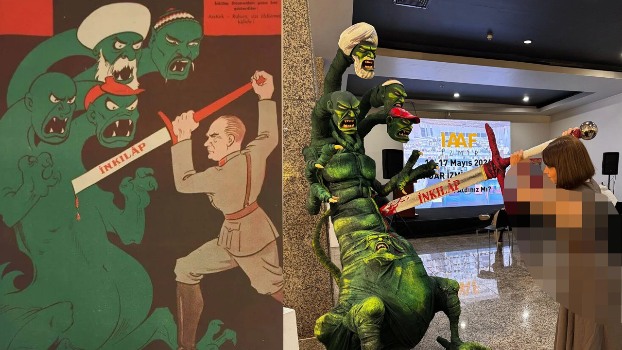 Sarıklı ve sakallı kişilerin canavarca tasvir edildiği heykelde, inkılap yazan bir kılıcın bu tasvirleri kestiği gösterilen bu figürde Kongre Merkezi'ni ziyaret eden bazı şahıslar da, bu menfur saldırıya katılarak ellerinde kılıçla poz verdi.