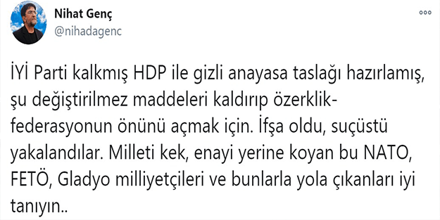 Nihat Genç, ‘İYİ Parti kalkmış HDP ile gizli anayasa taslağı hazırlamış, şu değiştirilmez maddeleri kaldırıp özerklik-federasyonun önünü açmak için. İfşa oldu, suçüstü yakalandılar. Milleti kek, enayi yerine koyan bu NATO, FETÖ, Gladyo milliyetçileri ve bunlarla yola çıkanları iyi tanıyın’ dedi.