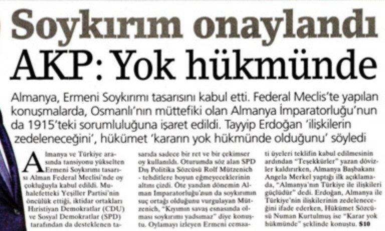 Türkiye düşmanı lobilerin yürüttüğü faaliyetlerin sonucu sözde Ermeni soykırımının Almanya tarafından onaylanmasını haberleştiren Birgün, "Soykırım onayladı" başlığıyla kimlere hizmet ettiğini bir kez daha ortaya koymuştu.
