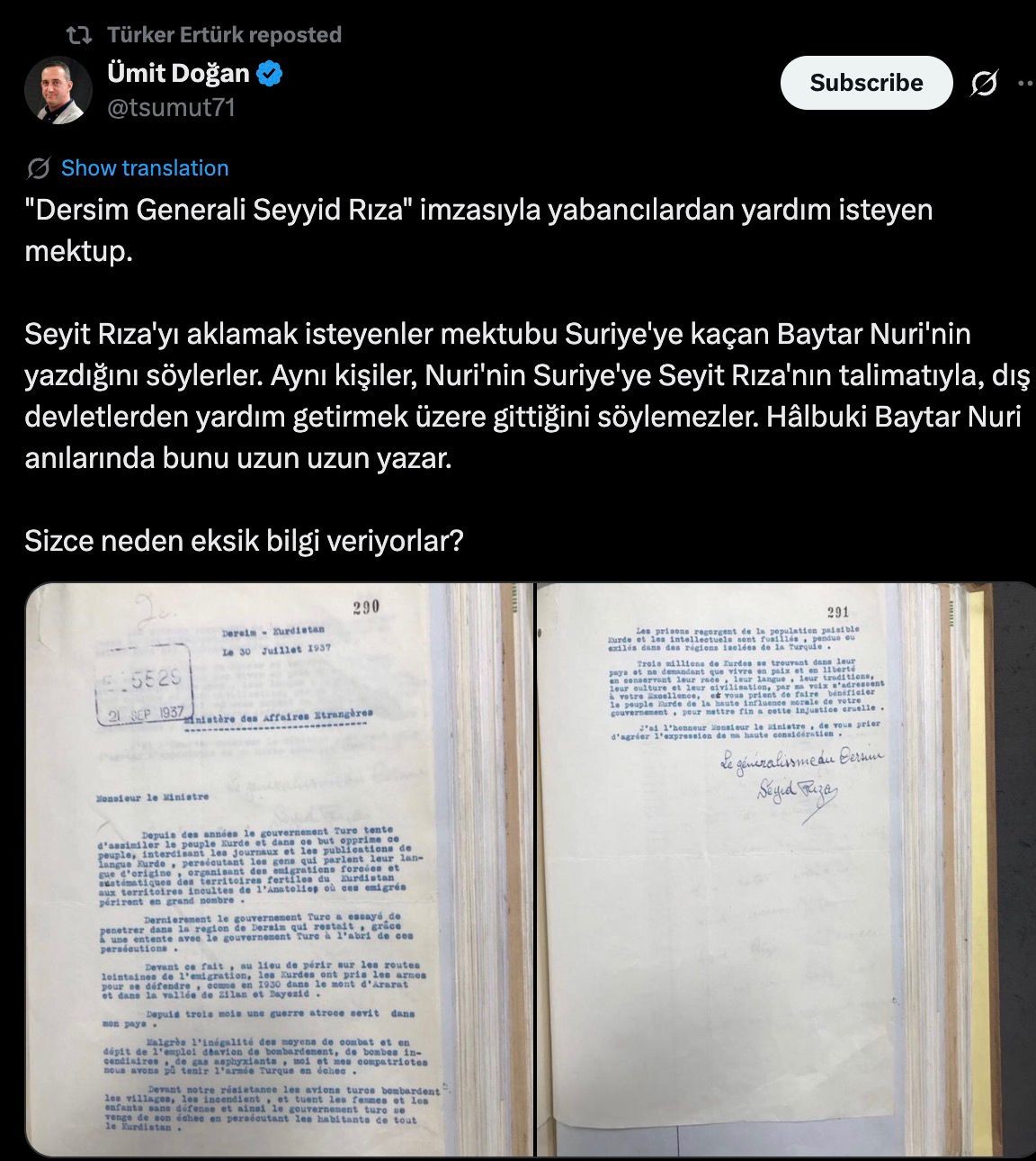 Seyid Rıza’nın Türkçe’yi dahi düzgün bilmediği gerçeğini gizleyen Doğan gibi isimler, mektupların yardımcısı Baytar Nuri tarafından kaleme alındığına dair anlatımları yok sayıyorlar. Aynı çevreler, Baytar Nuri’nin Suriye’ye Seyid Rıza’nın bilgisi ve talimatıyla dış destek aramak üzere gittiğini anlatan hatıratları da bilinçli şekilde saklıyorlar. İmzaya odaklananlar, sürecin tamamını karartmayı tercih ediyorlar.