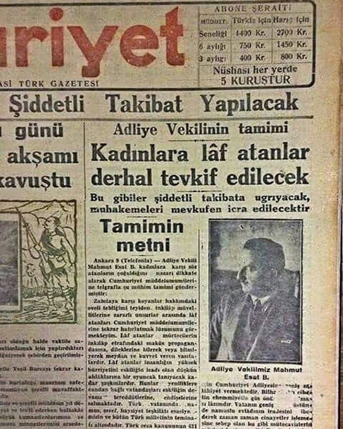 Dönemin Adalet Bakanı Mahmut Esat Bozkurt, 1929 tarihinde kadınları sözle taciz edenlerin çoğaldığına dikkat çekerek Cumhuriyet savcılarına bir genelge yollamış. Kadınları sözle taciz etmenin suç olduğu hatırlatılarak, şöyle deniliyor: