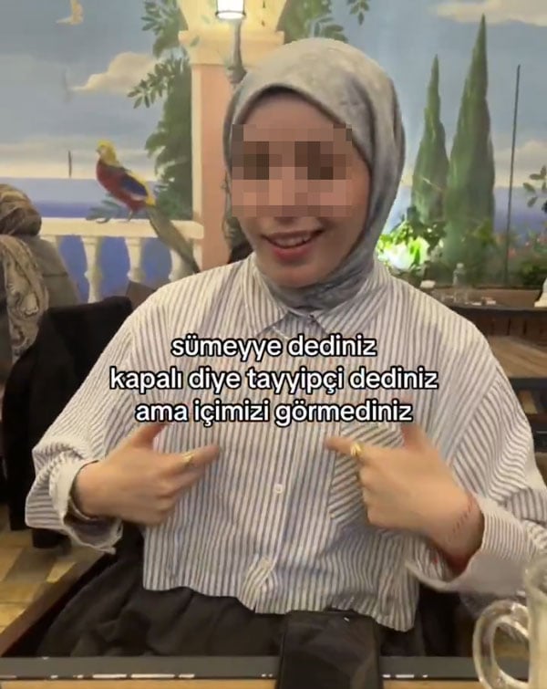 Onlardan biri, yayınladığı video ile infiale neden oldu. Paylaşımına, “Kapalı diye ‘Sümeyye’ dediniz, ‘Tayyipçi’ dediniz ama içimizi görmediniz” notunu düşen başörtülü genç kadın, gömleğini kaldırdı ve içine giydiği Mustafa Kemal’in kafasının baskılı olduğu tişörtü gösterdi.