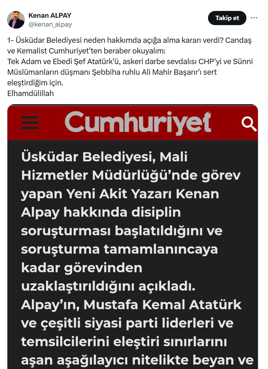 Alpay ayrıca, “Cumhuriyet Gazetesi’nin iftiralarına karşı, Üsküdar Belediyesi neden hakkımda açığa alma kararı verdi? Candaş ve Kemalist Cumhuriyet'ten beraber okuyalım: Tek Adam ve Ebedi Şef Atatürk'ü, askeri darbe sevdalısı CHP'yi ve Sünni Müslümanların düşmanı Şebbiha ruhlu Ali Mahir Başarır'ı sert eleştirdiğim için. Elhamdülillah. İÜ Sosyoloji'yi hakkımla kazandım ve bitirdim: İsmim asla usulsüz yatay geçişle, sahte diploma veya ihaleye fesat karıştırmakla anılmadı. Halka kan kusturan İslam düşmanı Tek Adam-Tek Parti ideolojisi ve kadrolarına, Baas/Esed yandaşlığına karşı çıkmak suç değil şereftir.” dedi.
