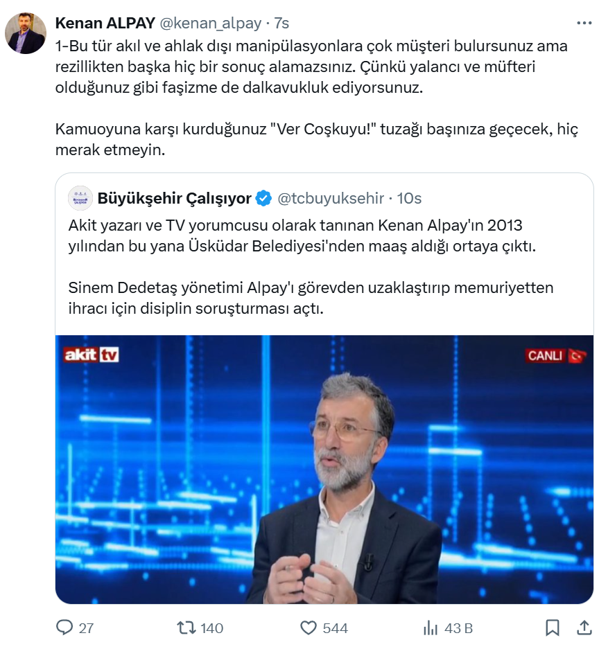 Gazeteci Kenan Alpay, 2013 yılından bu yana Üsküdar Belediyesi'nden maaş aldığı iddialarına karşı sert bir açıklama yaptı. Cumhuriyet Gazetesi’nde yer alan haberde, Alpay’ın 15 Ekim 2013 tarihinde Üsküdar Belediyesi’nde işe alındığı ve devlet memuru olarak istihdam edildiği belirtilmişti. Ancak Alpay, hakkında yapılan bu iddiaların ve Üsküdar Belediyesi tarafından açığa alınmasının arkasında siyasi bir manipülasyon olduğunu ileri sürdü.