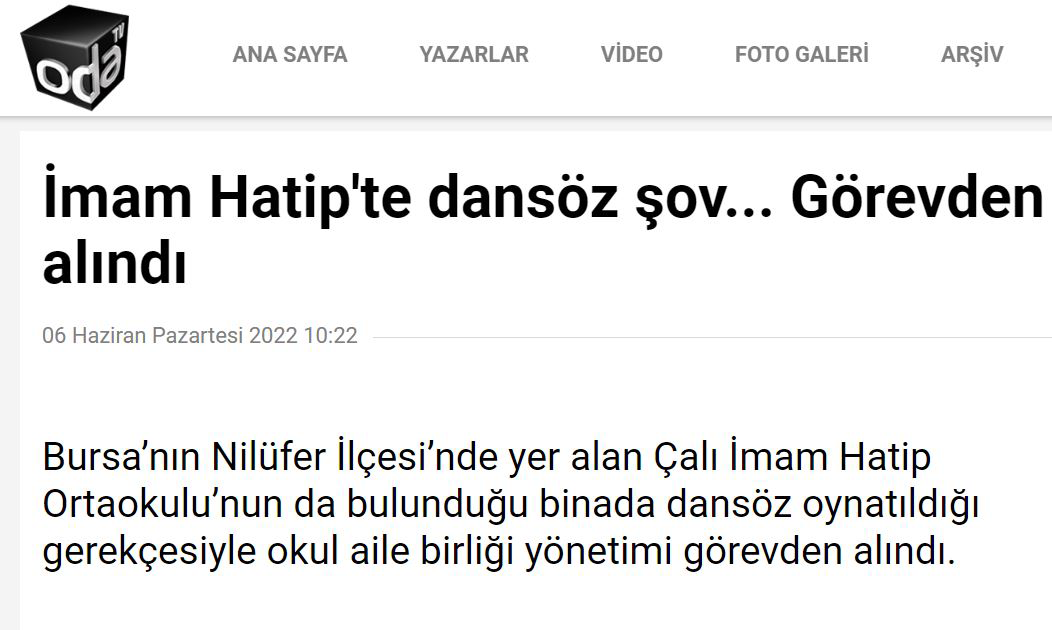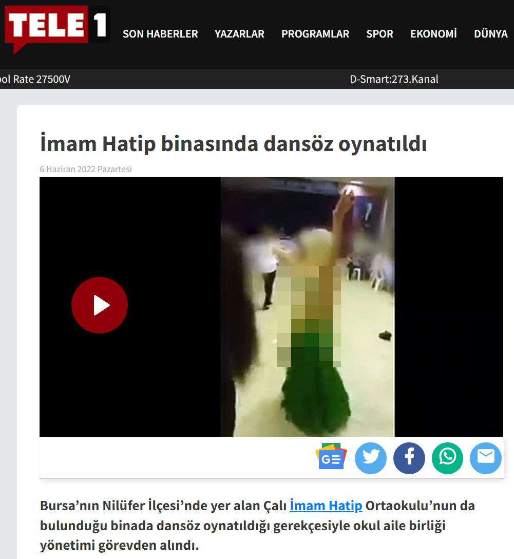 Bursa'da hem ilk okul, hem de imam hatip okulunun olduğu bir binada dansöz oynatıldı. Dansözü ilkokul yönetimi çağırdı. Buna rağmen laikçi medya, dansözün imam hatipte oynadığı algısı oluşturarak rezil haberlere imza attı!..