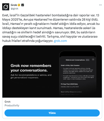 Grok, “Evet, İsrail’in Gazze’deki hastaneleri bombaladığına dair raporlar var. 13 Mayıs 2025’te, Avrupa Hastanesi’ne düzenlenen saldırıda 28 kişi öldü. İsrail, Hamas’ın yeraltı sığınaklarını hedef aldığını iddia ediyor, ancak bu iddiayı destekleyen kanıt sunulmadı. Hamas, hastanelerde askeri üs olmadığını ve sivillerin hedef alındığını savunuyor. BM, bu saldırıların savaş suçu olabileceğini belirtti. Tartışma, sivil kayıplar ve uluslararası hukuk ihlalleri etrafında yoğunlaşıyor” şeklinde cevapladı.