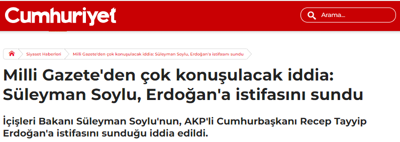Milli Gazete, birbiri ile çelişen haberler zincirine bugün, "Süleyman Soylu istifasını sundu, Erdoğan da görevden affını kabul etti." başlığı ile devam etti.