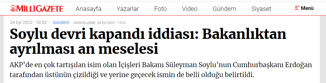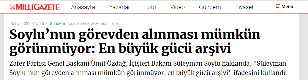 3 gün önce Bakan Soylu için, "Süleyman Soylu'nun görevden alınması an meselesi" şeklinde haber servis eden Milli Gazete, önceki gün de, "Soylu’nun görevden alınması mümkün görünmüyor: En büyük gücü arşivi" ifadelerinin yer aldığı bir habere imza attı.