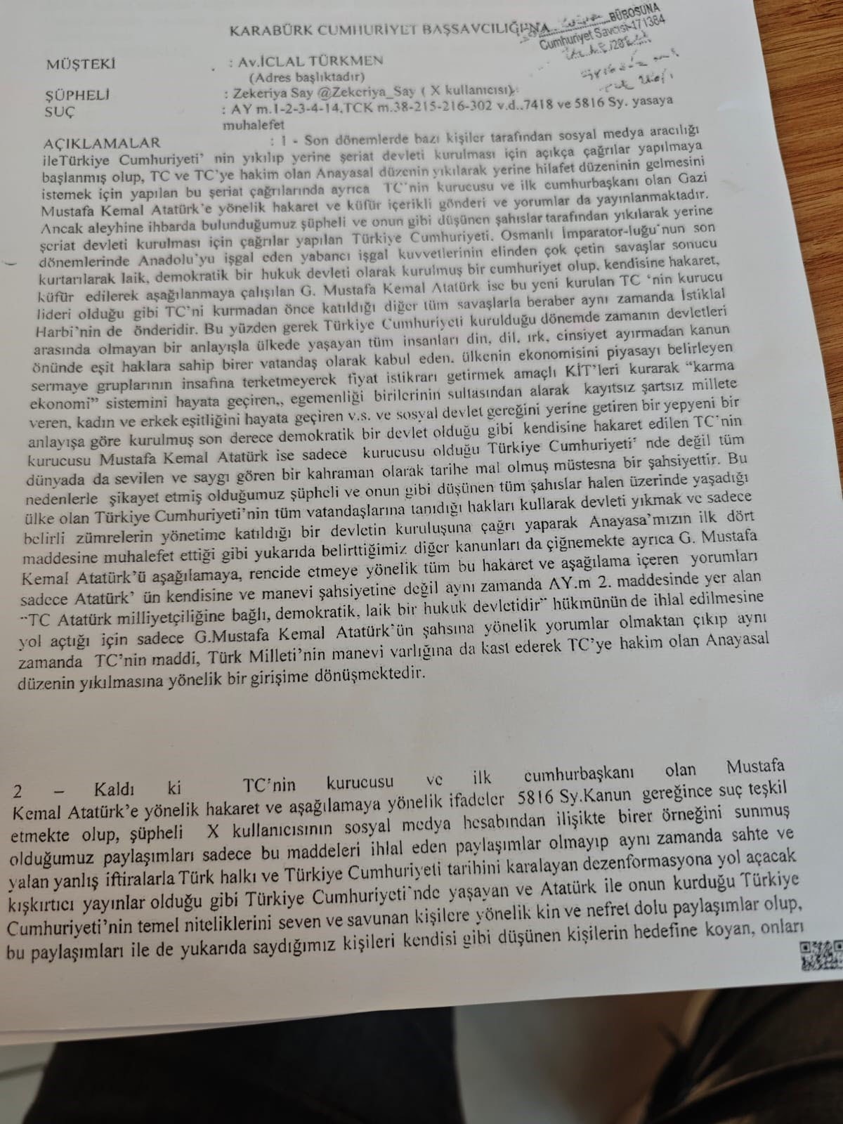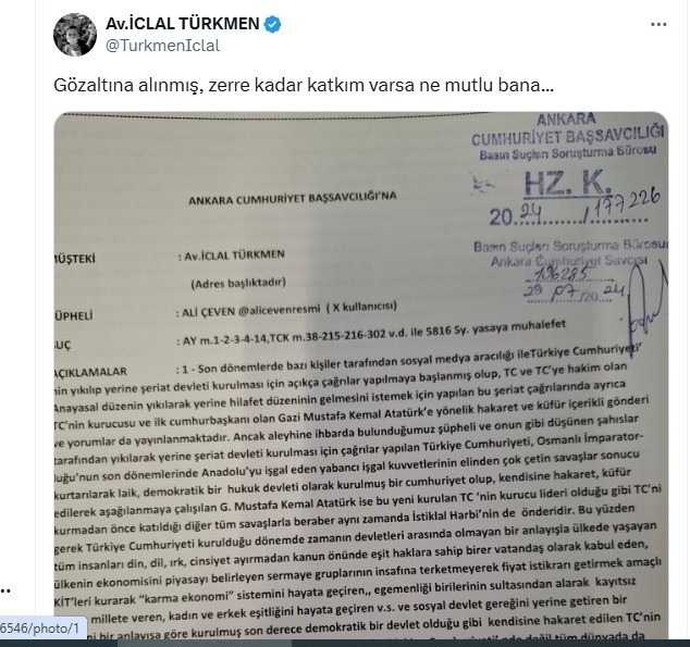 Malum zihniyete bağlı avukatlardan biri de akit’i hedef aldı. CHP’lilere ait gönderileri kendi hesabından paylaşacak kadar taraflı olan ve yargıyı bir ideoloji sopası olarak kullanan Ankara Barosu’na kayıtlı Avukat İclal Türkmen, somut hiçbir suç unsuru ve hakaret ifadesi yer almayan paylaşımları bahane ederek Haber Müdürümüz Zekeriya Say hakkında “5816 Sayılı Atatürk’ü Koruma Kanunu”na muhalefetten suç duyurusunda bulundu.