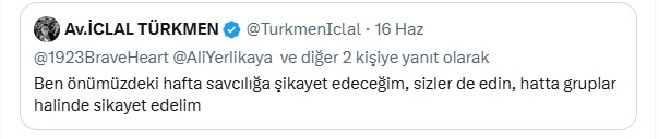 Avukat Türkmen, sorularımıza verdiği cevaplarla yasakçılığın bu kadarına da pes dedirtti. Devletin savcıları dururken neden durumdan vazife çıkardığını sorduğumuz avukat hanım, “Öncelikle avukatlık kanunundan kaynaklanan yetkiyle cumhuriyeti koruyorum. Cumhuriyeti yıkmak isteyen, Atatürk’e hakaret edenleri şikâyet ediyorum” dedi. Yaptığı itibar suikastına cumhuriyeti koruma kılıfı uyduran Türkmen’in CHP zihniyetine mensup trollerle birlikte hareket ederek ‘birlikte şikayette bulunalım’ tavsiyeleri vermesi ve sosyal medya üzerinden vatandaşlara “lavuk” diye hakaret etmesi ise dikkatlerden kaçmadı. Konuyla ilgili aradığımız Ankara 1 Nolu Baro yönetimi ise suç uydurarak vatandaşlara itibar suikastı yapan ve kendisini savcı yerine koyup insanları hedef alan hakaretçi avukata sahip çıktı.