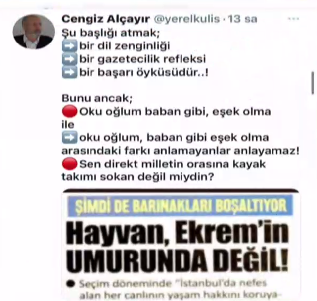 Siyasi olarak CHP'ye yakın bir çizgide olan gazeteci Cengiz Alçayır, Akit'in haberi üzerinden kendisine pay çıkaran CHP'li İBB Başkanı Ekrem İmamoğlu'na dil bilgisi dersi verdi.