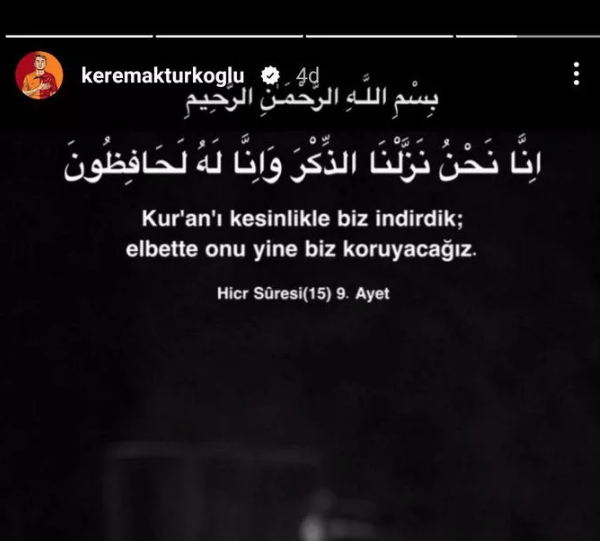 Galatasaray'ın yıldız futbolcusu Kerem Aktürkoğlu, Hicr Suresi'nin 9. ayetini paylaştı.