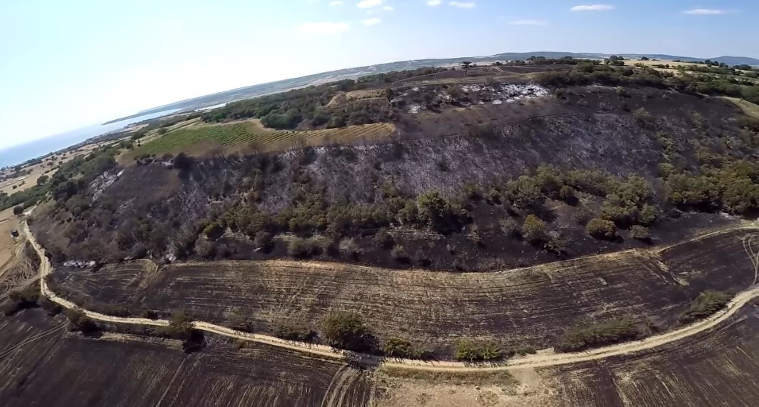 Edirne'nin Keşan ilçesine bağlı Mecidiye köyünde çıkan yangında dün kontrol altına alınmıştı. Alevlerden zarar gören 250 dönüm buğday ekili ve 100 dönümlük alan havadan görüntülendi.